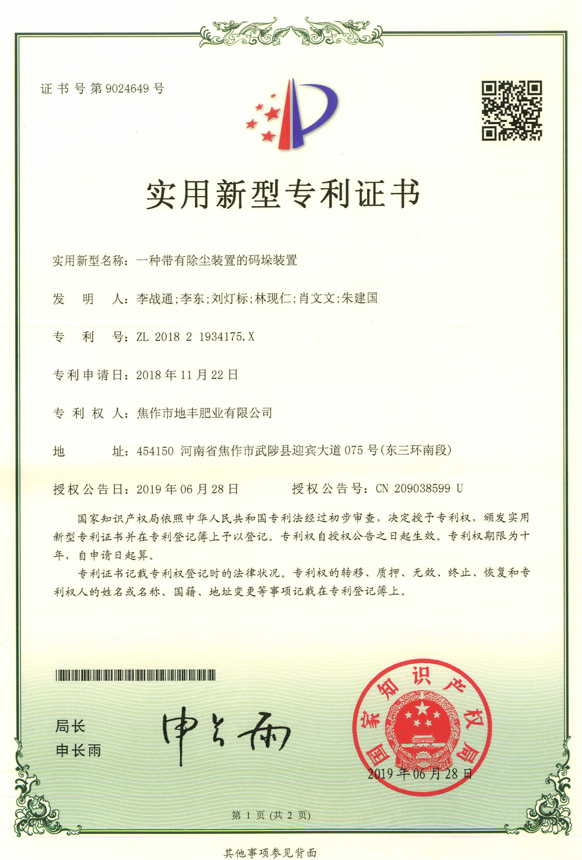 除塵裝置的碼垛裝置