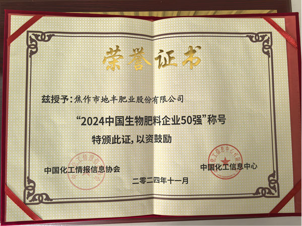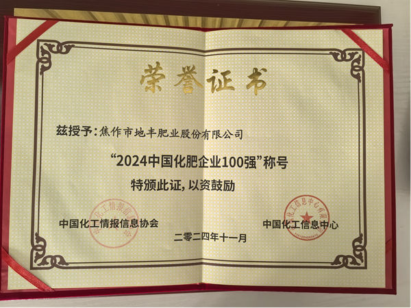 2024年11月29日,一條喜訊從鄭州傳來,在中國(guó)化肥企業(yè)100強(qiáng)評(píng)選活動(dòng)暨中國(guó)化肥產(chǎn)業(yè)新質(zhì)生產(chǎn)力論壇上,焦作市地豐肥業(yè)股份有限公司再次榮獲“中國(guó)化肥企業(yè)